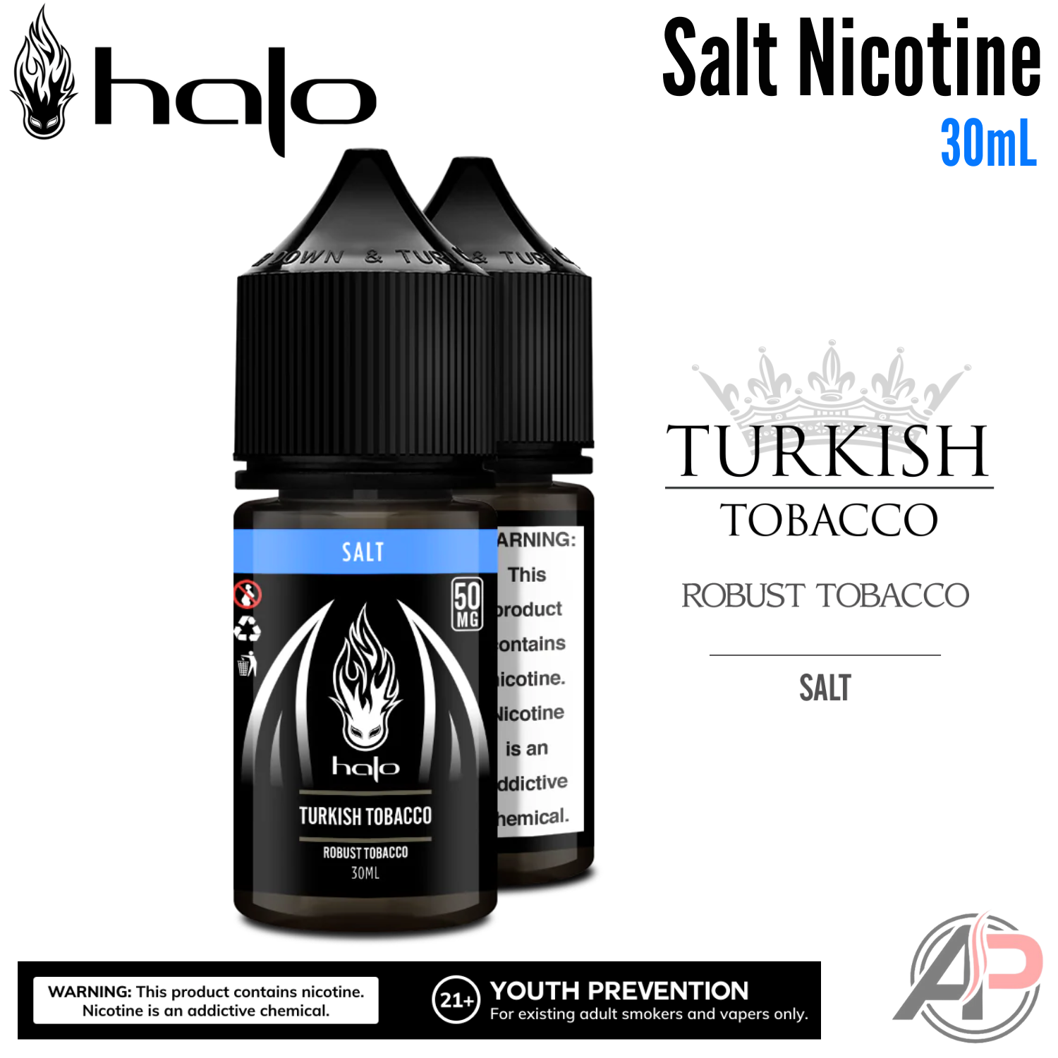 - 1 X Halo Turkish Robust Tobacco Salt Nicotine Vape Juice 30mL.